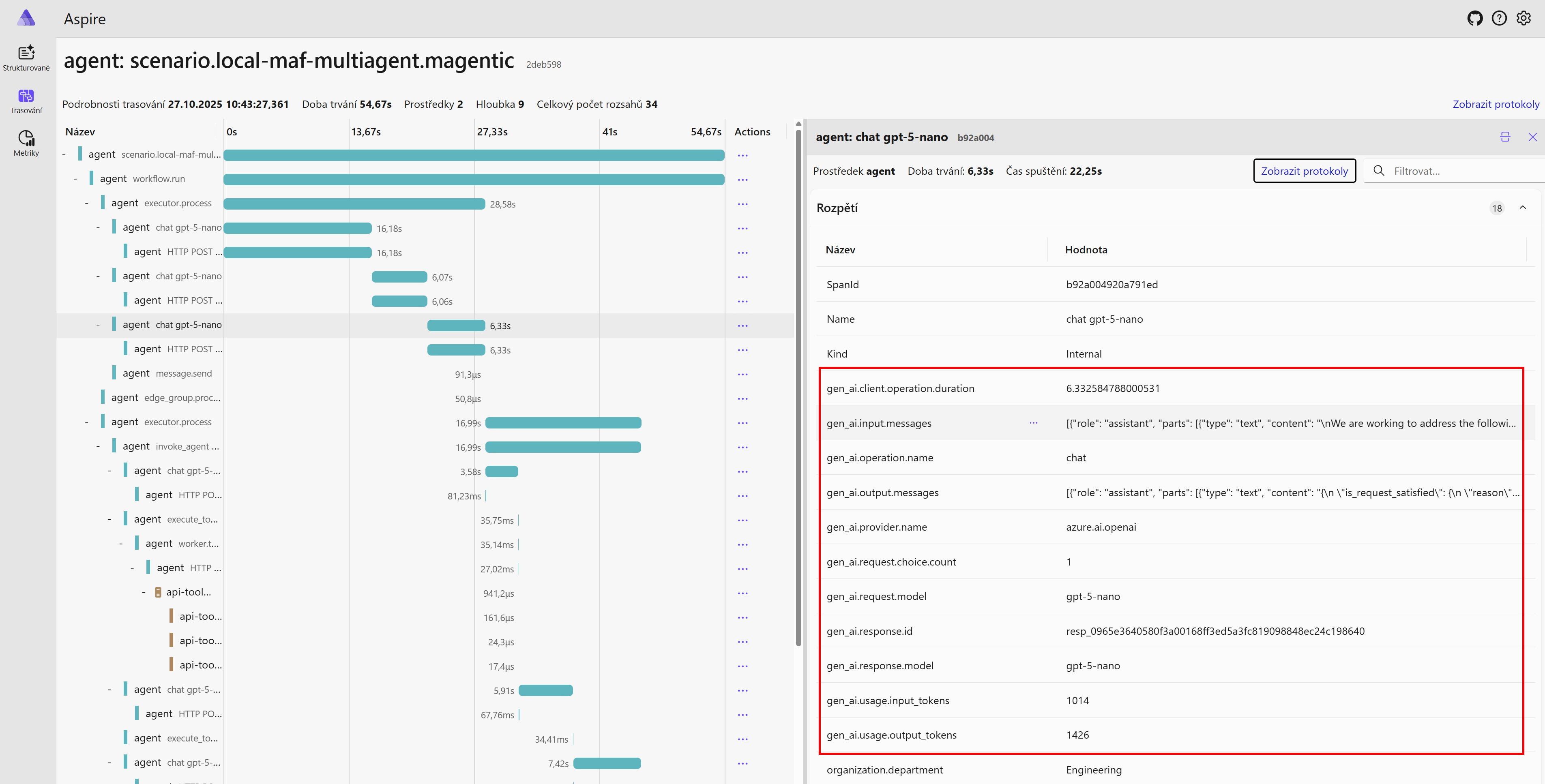 OpenTelemetry podporuje přidávání jakýchkoli atributů do trasování a to v minulosti vytvářelo poměrně zmatek, protože řešení jako je OpenInference, LangFuse nebo LangSmith pojmenovávali atributy různě a přestože tak máte OpenTelemetry standard, tak různé hotové reporty, vizualizace a analýzy nefungovaly univerzálně. Dnes ale existují tzv. semantic conventions pro GenAI, které Microsoft dodržuje a dokonce je před časem rozšířil pro atributy na multi-agent scénáře (už to bylo do standardu oficiálně přijato) a Microsoft Agent Framework tyto všechny dodržuje. Dokumentaci najdete na Semantic conventions for generative AI systems.