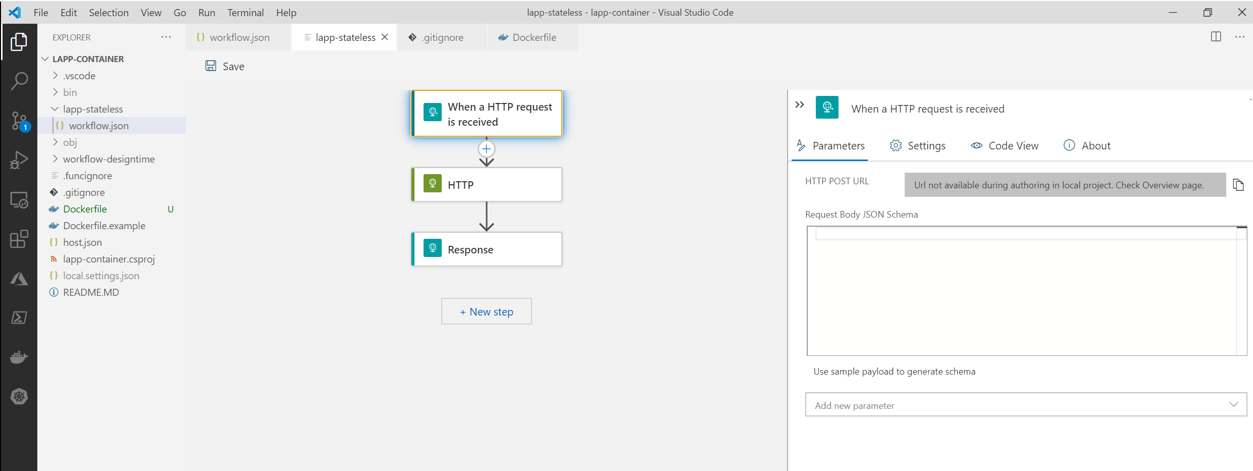Azure Functions framework lze zabalit do kontejneru a ten pustit dokonce i mimo Azure. Možnosti triggerů pak jsou logicky dost omezené, ale http trigger fungovat bude, tak to vyzkoušejme. Vytvořil jsem dle návodu Dockerfile a celý projekt zbuildoval. Následně jsem svou Logic App pustil lokálně v kontejneru na notebooku.