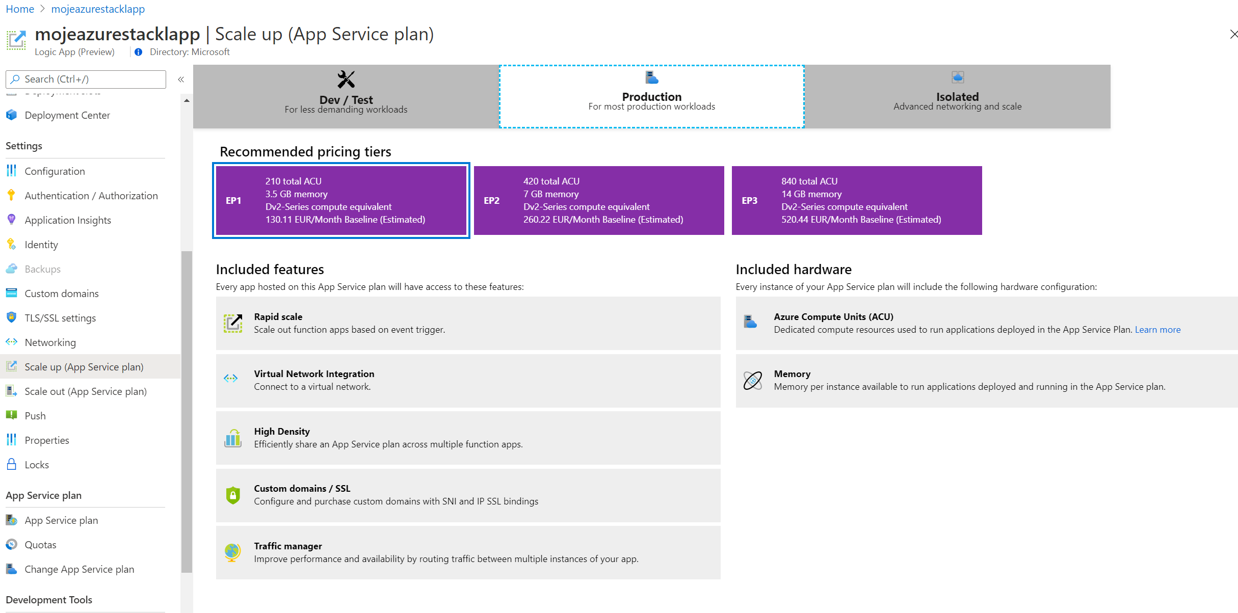 Mám také možnost řešit jak velké mašiny pod tím chci a to jak v mém případě Azure Functions Premium, tak běžný App Service plán.