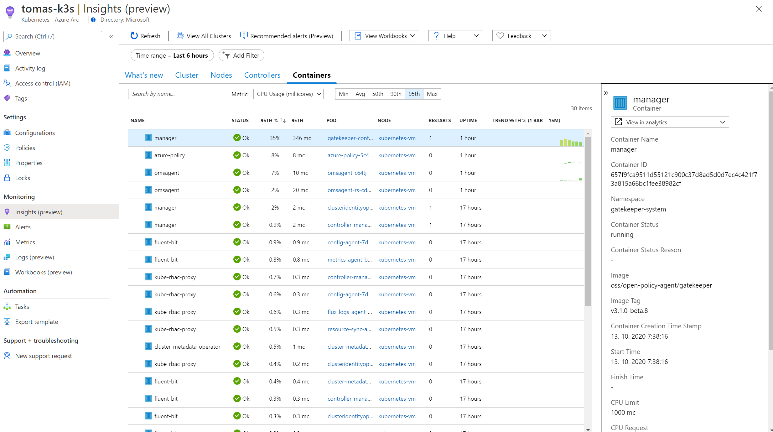- Inventarizace - napojené clustery jsou další zdroj v Azure, takže patří do subskripce, resource group, mají tagy a jsou v nich informace o Kubernetes objektech a jejich historii