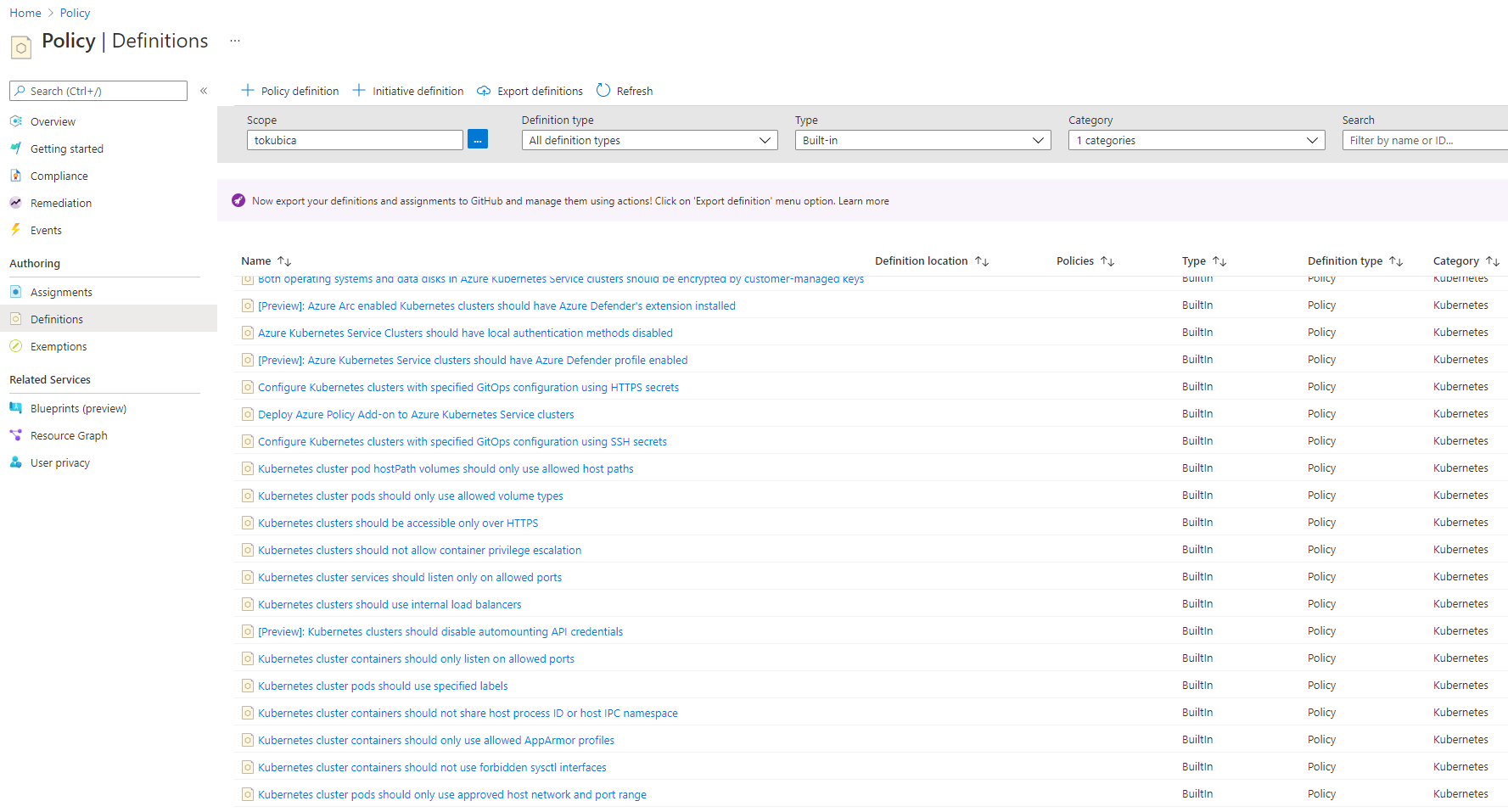 V katalogu Azure Policy definic najdete databázi připravených politik vhodných pro jednoduchou aplikaci na váš Kubernetes cluster a to jak Azure Kubernetes Service tak jakýkoli jiný Kubernetes/OpenShift běžící kdekoli a napojený do Azure přes Azure Arc. Podívejme co je pro Kubernetes k dispozici.