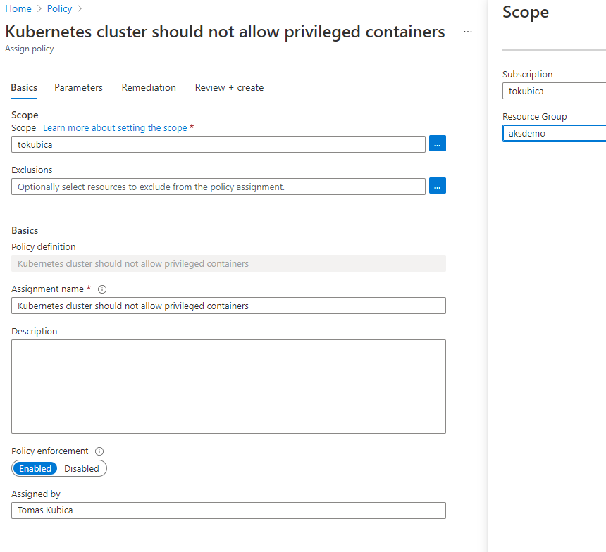 - Kubernetes cluster containers should only use allowed images - je dobrou praxí neumožňovat v produkci stahování kontejnerů z veřejných zdrojů jako je Docker hub, protože nemáte pod kontrolou, zda tam nejsou nějaké zranitelnosti a tak podobně. Bezpečný proces je vždy mít kontejnery v registru pod vaší kontrolou a to včetně scanování zranitelností. I když bude kontejner pocházet z veřejného zdroje, tak byste měli mít proces jako ho stáhnout, oscanovat a publikovat ve vašem interním repozitáři. V tomto pravidle jsem nastavil regex tak, že dostupný bude pouze můj Azure Container Registry, který jsme v předchozích krocích vytvořili. Můj regex vypadá takhle: ^tomaskubicaaksdemo.azurecr.io/.+$