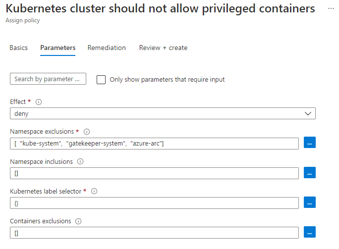 Dál mohu specifikovat parametry. Effect Deny říká, že přímo v Kubernetu dojde k odmítnutí Podu, který by chtěl být privilegovaný. Volba audit to povolí, ale bude křičet, že politika není v tomto clusteru compliant. Další volby umožňují dát výjimky na některé namespace (třeba kube-system, kde je něco takového reálně potřeba), nechat politiku spadnout na všechny ostatní nebo naopak explicitně říct namespace, na kterém se má aplikovat. Jste schopni i jít ještě detailněji například po labelech podů případně konkrétní kontejnery v Podech uvést jako výjimku.