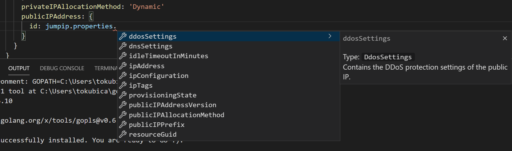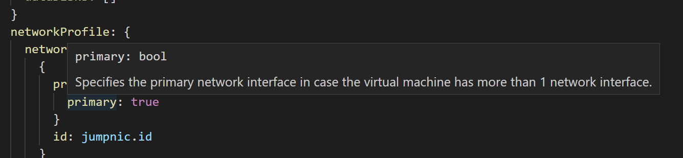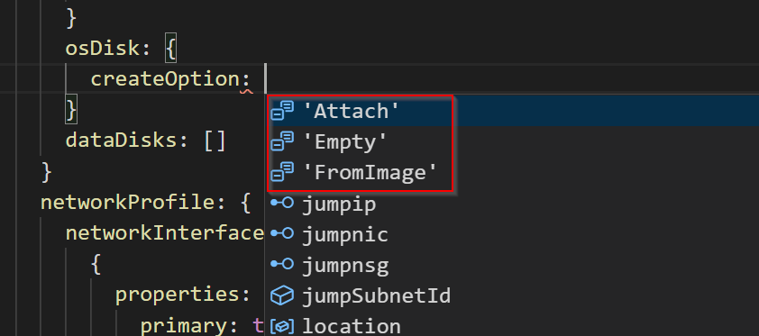 Stejně jako pro Terraform umí VS Code radit a doplňovat, ale pro Bicep je to opravdu vychytané. V zásadě pro mě téměř zmizela potřeba se dívat do dokumentace nebo kopírovat příklady. Co mě opravdu příjemně překvapilo je to, že editor napovídá nejen klíče, ale i hodnoty. To je pro mě hodně užitečné: