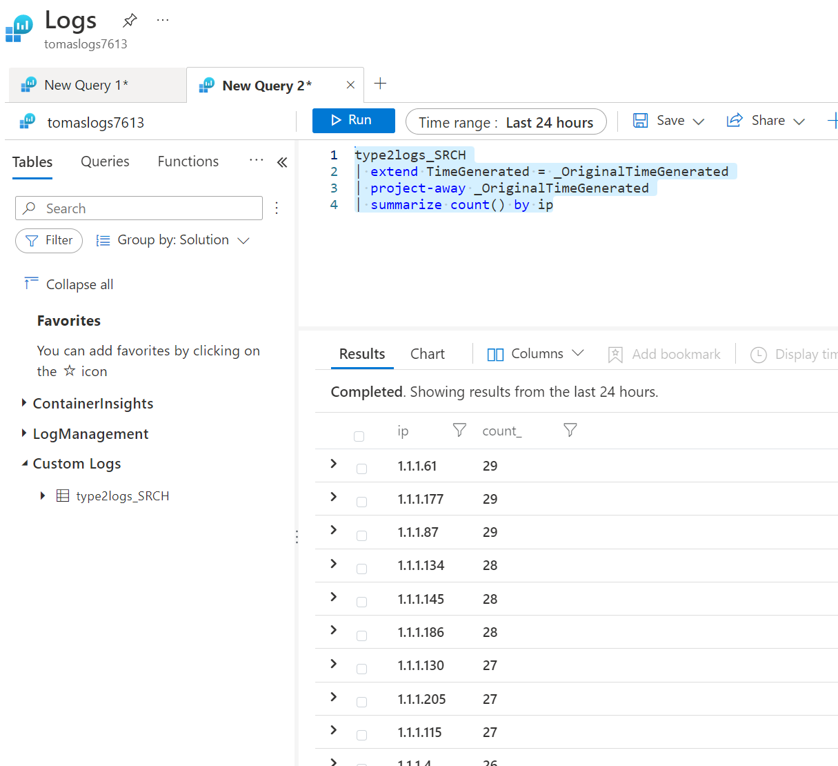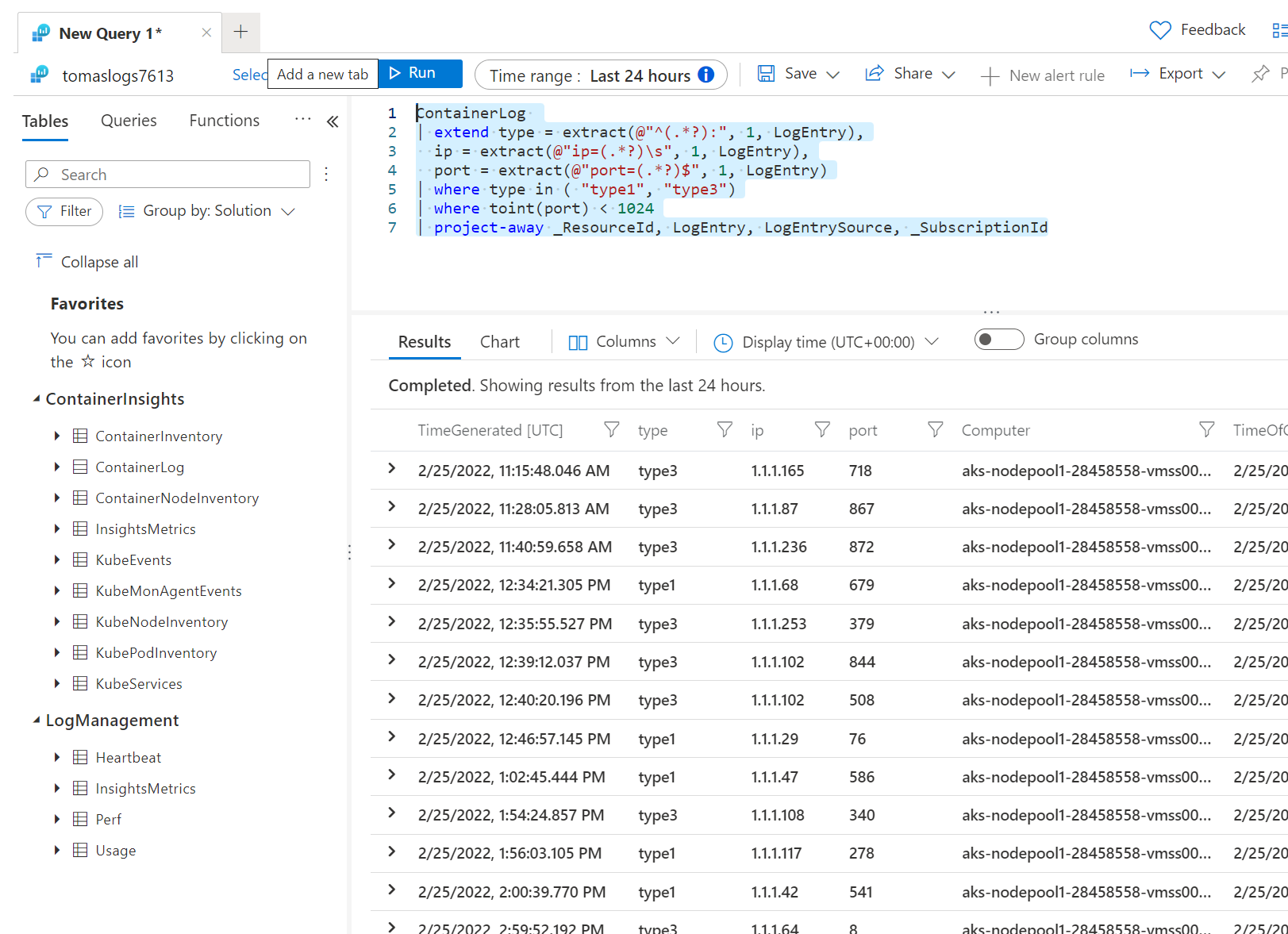 "description": "This table was created using a Search Job with the following query: 'ContainerLog \r\n| extend type = extract(@\"^(.*?):\", 1, LogEntry),\r\n ip = extract(@\"ip=(.*?)\\s\", 1, LogEntry),\r\n port = extract(@\"port=(.*?)$\", 1, LogEntry)\r\n| where type == \"type2\"\r\n| project-away _ResourceId, LogEntry, LogEntrySource, _SubscriptionId'.",