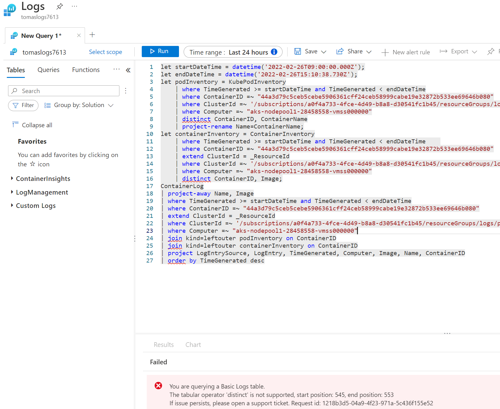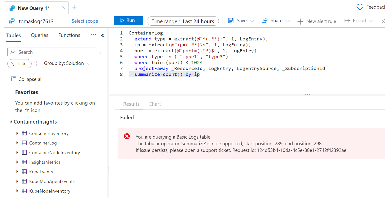 Na závěr - basic logs neumožňují joiny a jiné složité operace a to ovlivnilo UI Container Insights v Azure Monitor, které joinuje ContainerLogs s několika dalšími tabulkami s inventářem (jak se jmenoval Pod a tak).