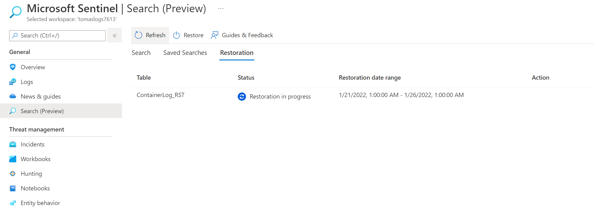 Místo search jobu můžeme také přistoupit k zavlažení archivních logů. Jak jsem minule popisoval, funguje to tak, že se data na nějakou dobu přesunou do analytického tieru a můžete se pak v nich prohrabávat naplno. Platíte podle objemu zavlažených dat a to za každý načatý den, kdy je chcete držet v analytice. Všimněte si, že v následujícím API volání nemůžeme specifikovat query, jen časové okno (minimum jsou dva dny). Pokud tedy hledám něco dost specifického, co mi z tabulky vrátí méně jak 4% dat, je výhodnější dát search job a zaplatit ingesting. Pokud ale nevím přesně co hledám a budu dat vracet významnější procento, bude výhodnější je zavlažit. V API stačí opět vytvořit novou tabulku tentokrát s příponou _RST a v properties specifikovat resourceLogs s časovým oknem a zdrojovou tabulkou.