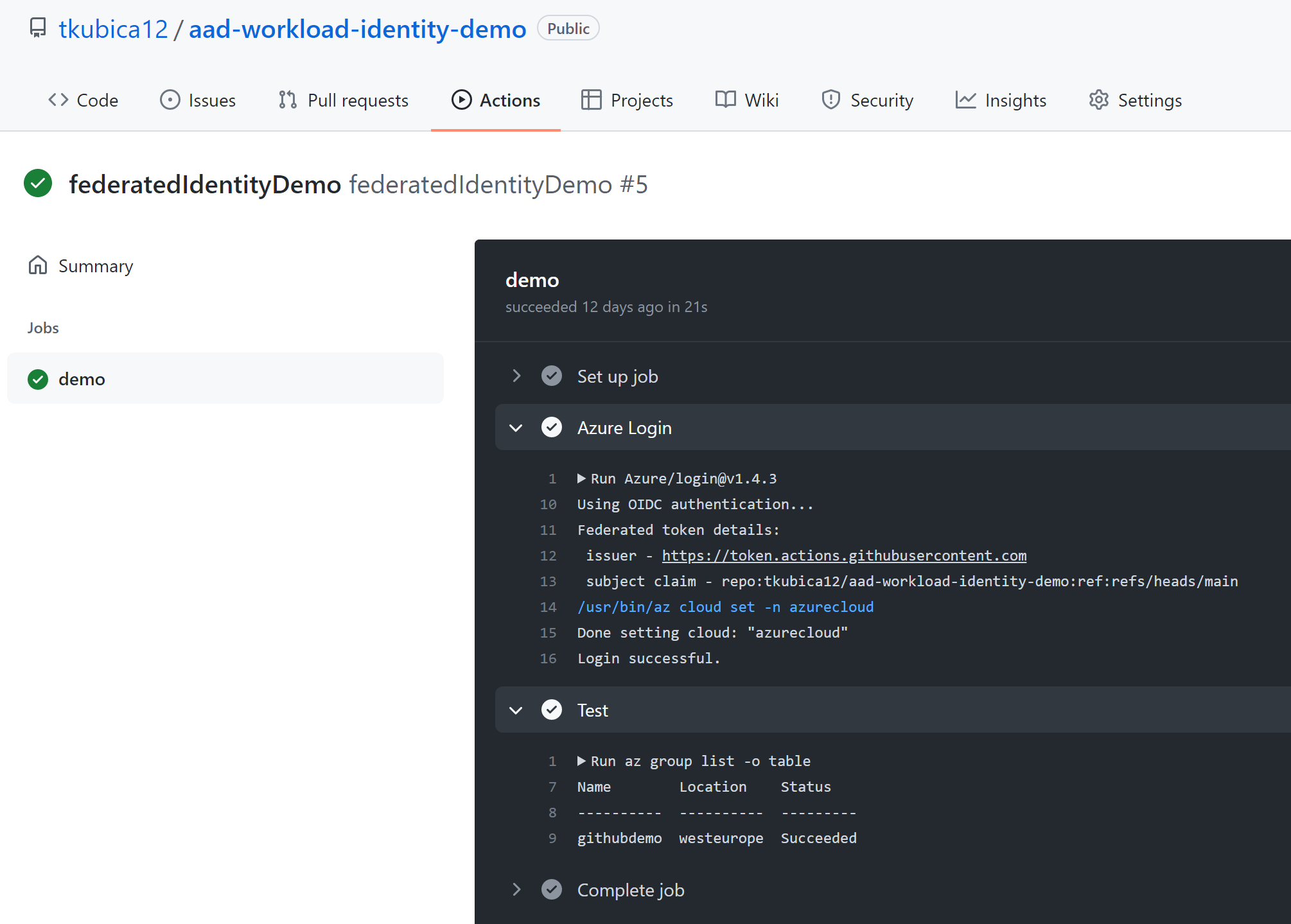 Všimněte si akce Azure Login. Není tam žádné heslo ani certifikát! Tato akce tak pozná, že se má pokusit použít federovanou identitu. A to je všechno - vše potřebné pro mě udělala, můžu přistoupit do Azure. Samozřejmě pokud byste potřebovali přistoupit do něčeho jiného, než Azure managementu (například do Key Vault nebo SQL a tak podobně), nebude problém to zařídit, ale musíte si výměnu tokenů ošetřit sami.
