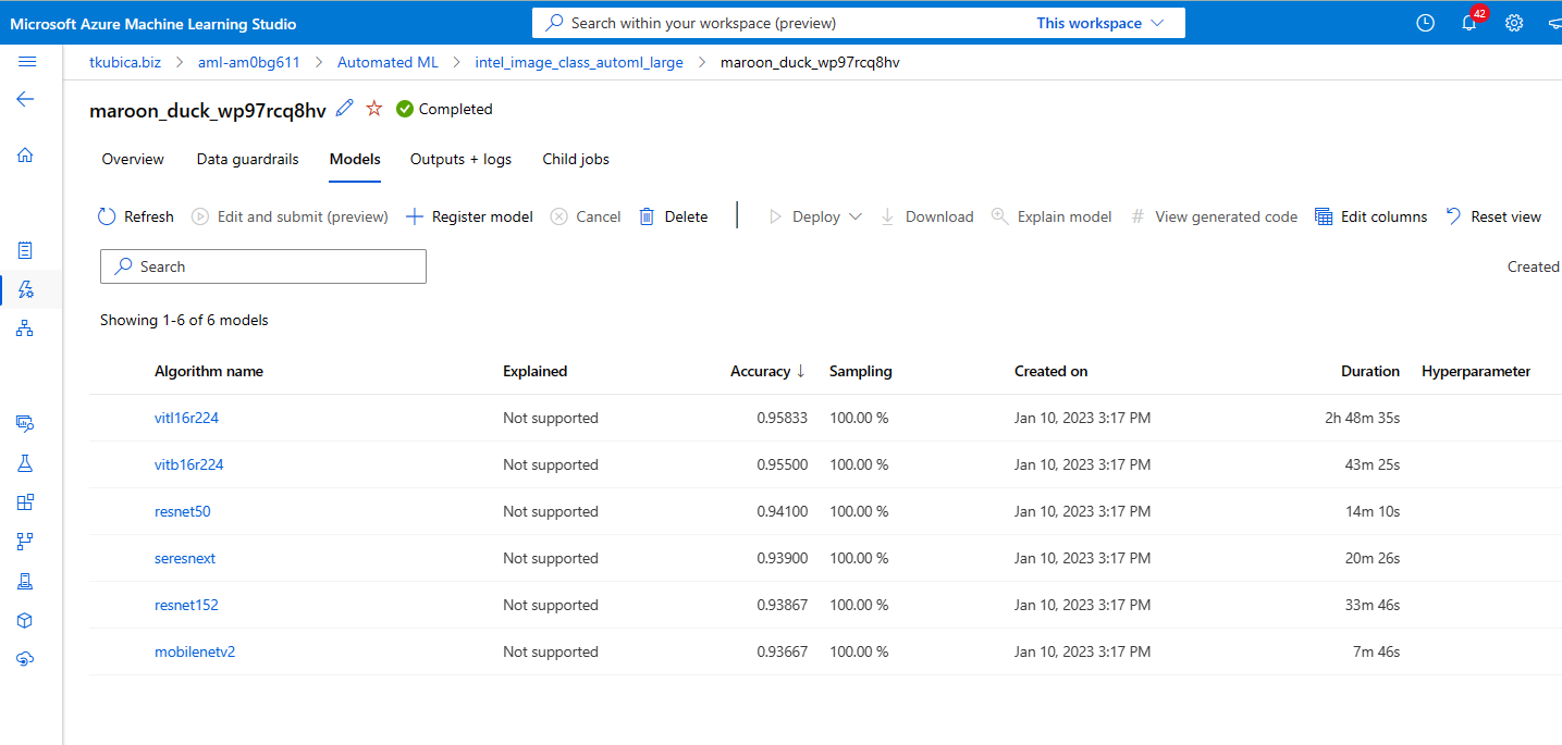 Ostatní jsou ale také zajímavé - například resnet50 dává 94,1% accuracy, ale zvládne se dotrénovat za 14 minut - více jak 10x rychleji (= levněji) a MobileNetV2 ještě o polovinu rychleji (s accuracy 93,6%) a je to model, který je velmi efektivní i na spotřebu zdrojů při inferencingu (například pro běh v mobilu). Uvažme, že resnet50 za stejné náklady dává dramaticky lepší výsledky, než můj vlastní jednoduchý CNN model. Na mém problému je tedy jednoznačně vidět, že transfer learning, tedy převzít váhy z masivně protrénovaného modelu, se mi hodně vyplatilo. Navíc všechny vyzkoušené modely jsou lepší, než když jsem si tranfer learning udělal sám (výsledek tam byl 91,7%) - takže pokud stejně jako já tomu nerozumíte dostatečně, AutoML vám dá do začátku nejlepší výsledky.