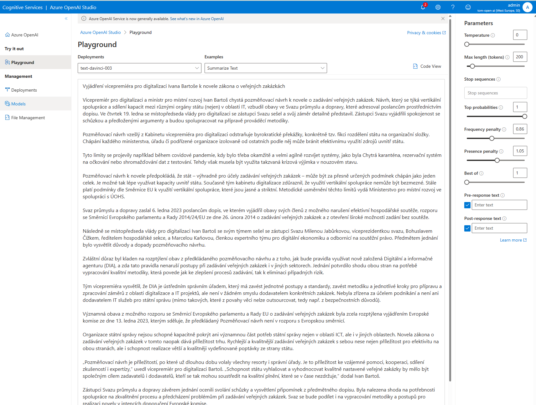 Azure OpenAI Service - sumarizace textu v češtině prakticky