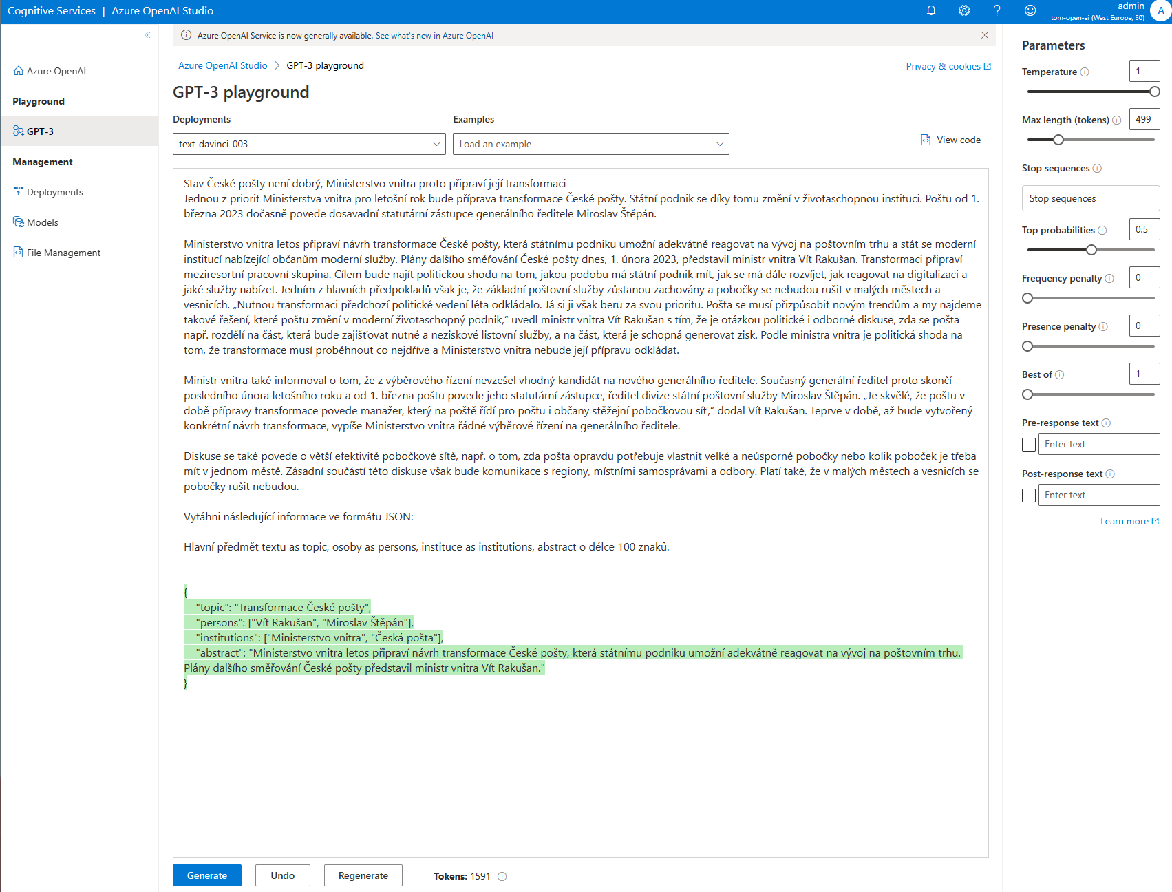 Azure OpenAI Service - vytažení informací z českého textu do JSON