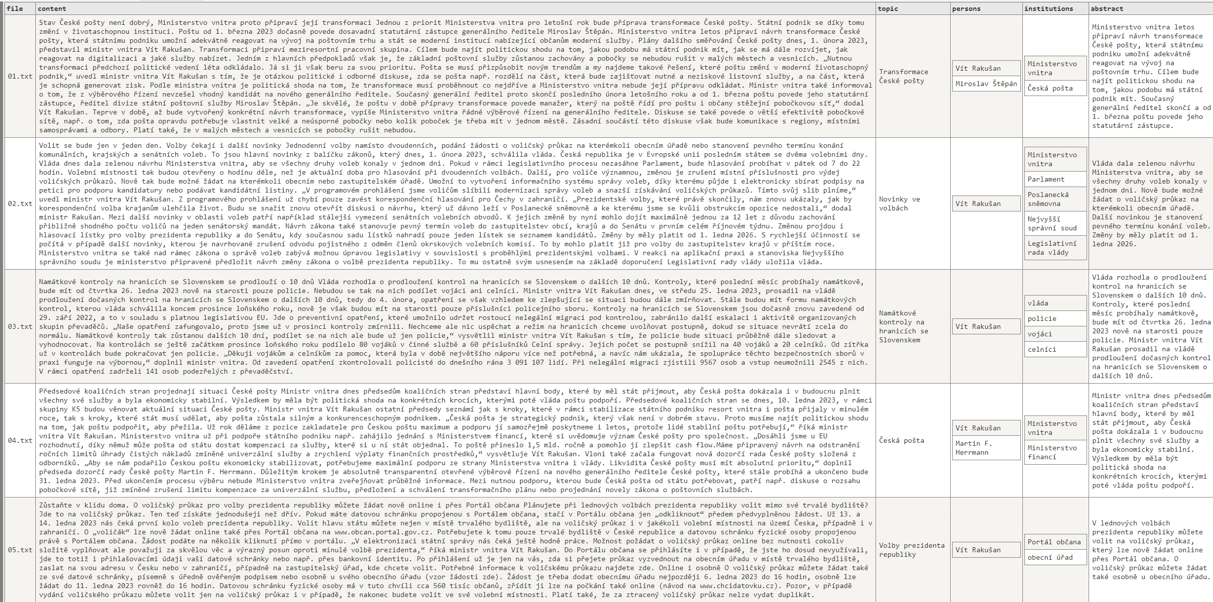 Tady je kód - nic složitého. Načtu obsah souborů z adresáře (mám tam co txt file, to tisková zpráva) do Pandas DataFrame, připravím si lambda funkci, která k textu přidá můj volně napsaný “příkaz” co chci dosáhnout a provolám ji přes apply na DataFrame. Jediná možná nezvyklost je, že potřebuji vrátit/vytvořit vícero sloupečků, ale to není problém.